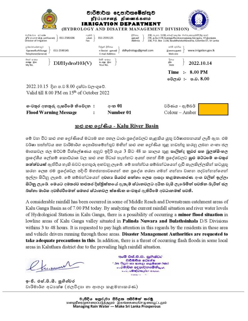 එමෙන්ම කළු ඟග ද්රෝණිය ආංශිතව පදිංචි පාලින්ද නුවර සහ බුලත්සිංහල ප්රාදේශීය ලේකම් කොට්ඨාසවල ජනතාවට කළු ගඟ පිටාර ගැලීම නිසා ඉදිරි පැය 3 -48 කාලය තුළ ඇතිවියහැකි සුළු ගංවතුර තත්වය පිලිබඳ අවධානයෙන් පසුවන ලෙස වාරිමාර්ග දෙපාර්තමේන්තුව දැනුම් දෙනවා.
