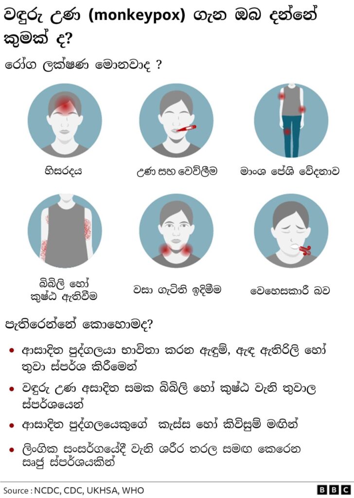 බොහෝ විට මෙම රෝගය කැසීමත් සමඟ සම මතුපිට කුඩා බිබිලි ඇතිවීමෙන් ආරම්භ වී පසුව අත් පා හරහා ව්යාප්තව තුවාළ කැළැල් දක්වා අවධීන් කිහිපයක් ගමන්කර දින 14 සිට 21 දක්වා පවතින ස්වයං ව පහව යන වෛරස් රෝගයකි. මෙතෙක් මෙරටට දී වඳුරු උණ රෝගය ආසාදිතයකු හඳුනා නොගත් අතර, වඳුරු උණ (මන්කිපොක්ස්) රෝගය ආසාදනය වූ පළමු ශ්රී ලාංකික පුද්ගලයා හඳුනාගත් බව අද වාර්තා කර තිබුණා.
