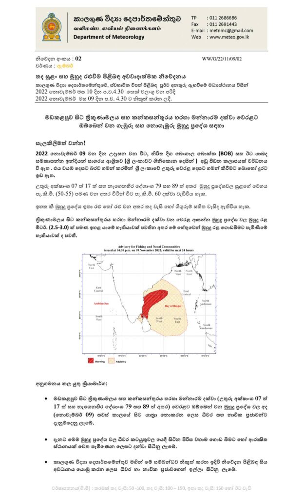 වැසි තත්වයේ වැඩිවීමත් සමඟ ඇතිවෙන තද සුළං හේතුවෙන් මුහුද රළ රළුවිය හැකි අතර, මුහුදු රළ ගොඩට ගැලීමේ අවදානමක් පවතින බවට අවවාදාත්මක නිවේදනයක් කාලගුණ විද්යා දෙපාර්තමේන්තුව විසින් නිකුත් කර තිබෙනවා.