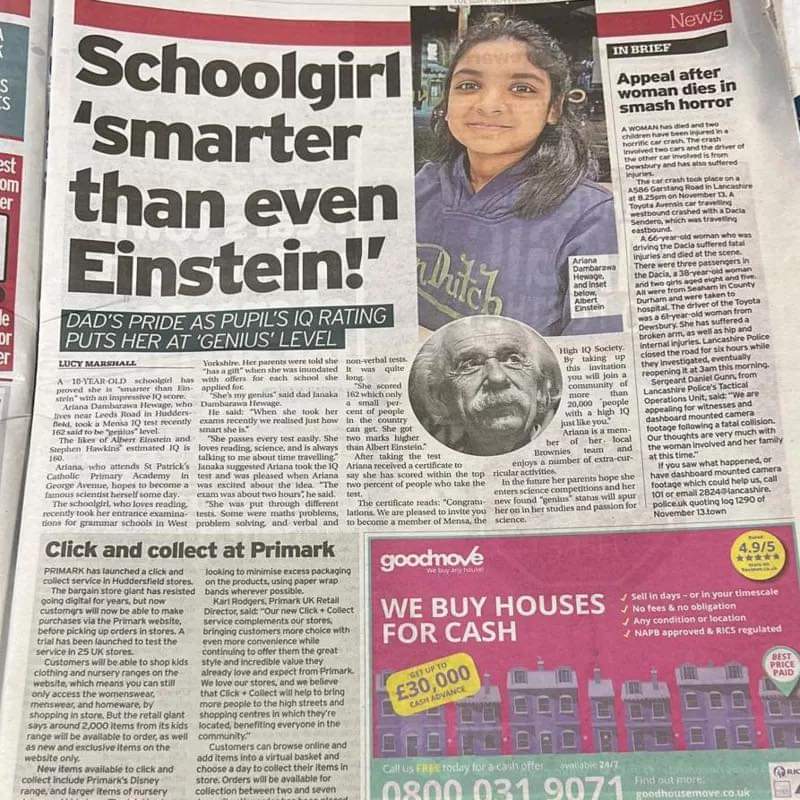 ලොව මෙතෙක් බිහිවූ විශිෂ්ටතම විද්යඥයින් දෙදෙනෙකු ලෙස සැලකෙන ඇල්බර්ට් අයින්ස්ටයින් සහ ස්ටීවන් හෝකින්ස්ගේ IQ මට්ටම ඉක්මවා ගිය ශ්රී ලාංකික සම්භවයක් සහිත දැරියක පිළිබඳව එක්සත් රාජධානියෙන් වාර්තා වේ. අරියානා හීමාල් ධර්මසේන නමැති 10 හැවිරිදි පාසල් දැරියක මෙම දක්ෂතාව දක්වා තිබේ.