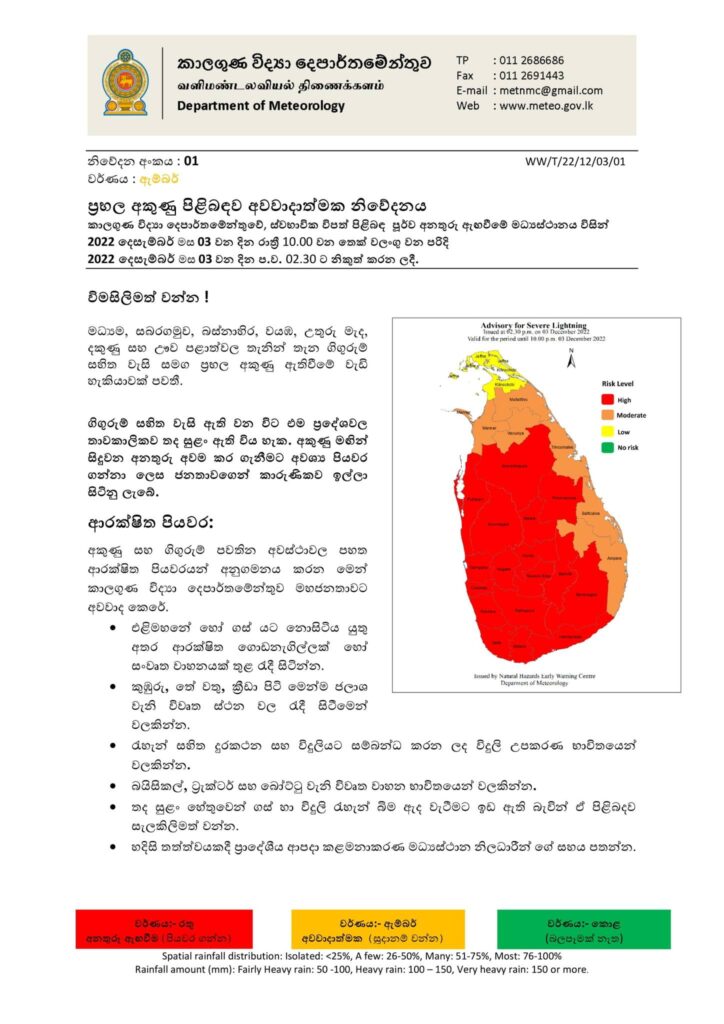 වැසි සමඟ තාවකාලික තද සුළං ඇතිවිය හැකි අතර අකුණු මඟින් සිදුවෙන අනතුරු අවම කර ගැනීමට අවශ්ය පියවර ගන්නා ලෙස කාලගුණ විද්යා දෙපාර්තමේන්තුව ජනතාවගෙන් ඉල්ලා සිටිනවා.