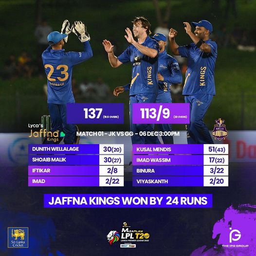 ඒ අනුව LPL පළමු තරඟය ලකුණු 24 කින් ජය ගැනීමට Jaffna Kings කණ්ඩායම සමත් වූ අතර දුනිත් වෙල්ලාලගේ තරඟයේ වීරයා බවට පත්වුණා.