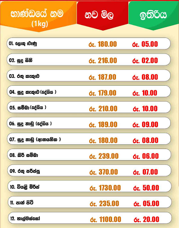නව මිල ගණන් අද සිට ක්රියාත්මක වන අතර මිල පහළ දමන ලද භාණ්ඩ ලැයිස්තුව පහතින්,