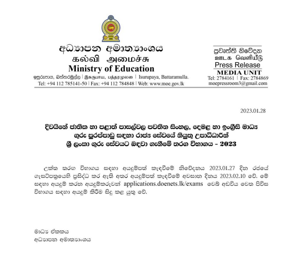දිවයින පුරා ජාතික සහ පළාත් පාසැල්වල පවතින සිංහල, දෙමළ සහ ඉංග්රීසි මාධ්ය ගුරු පුරප්පාඩු සඳහා ගුරුවරුන් බඳවාගැනීමට පැවැත්වෙන තරග විභාගය සඳහා රජයේ සේවයේ නියුතු උපාධිධාරීන්ගෙන් අයදුම්පත් කැඳවීම ආරම්භ කර ඇති බව රජය නිවේදනය කරනවා.