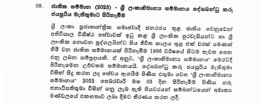 ශ්‍රී ලංකා ජනරජය සහ ජාතිය වෙනුවෙන් අතිවිශාල සේවයක් ඉටු කිරීම වෙනුවෙන් එක්වරක් පමණක් හිමිවන “ශ්‍රී ලංකාභිමාන්‍ය සම්මානය” දේශබන්ධු කරු ජයසූරිය මහතා වෙත 2023 පෙබරවාරි මස 03 දින පිරිනැමීමට ජනාධිපතිවරයා විසින් ගනු ලැබූ පියවරයන් සම්බන්ධයෙන් කැබිනට් අනුමැතිය හිමිවූ බවයි කැබිනට් මාධ්‍ය ප්‍රකාශක බන්දුල ගුණවර්ධන මහතා ප්‍රකාශ කළේ.