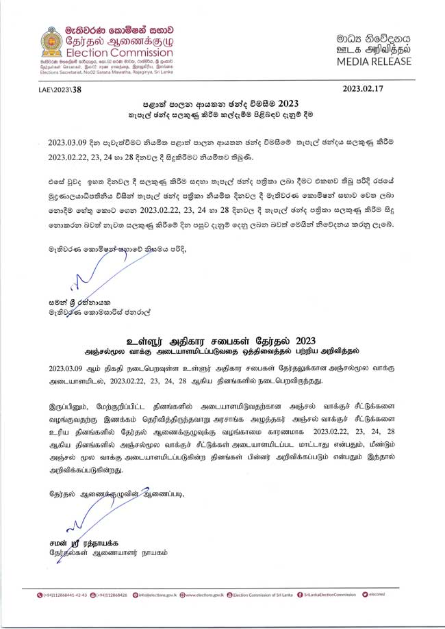 පෙබරවාරි 22,23 සහ 24 දින වල පැවැත්වීමට තීරණය කර තිබූ තැපැල් ඡන්ද විමසීම කල් දැමීමට තීරණය කර තිබෙනවා.