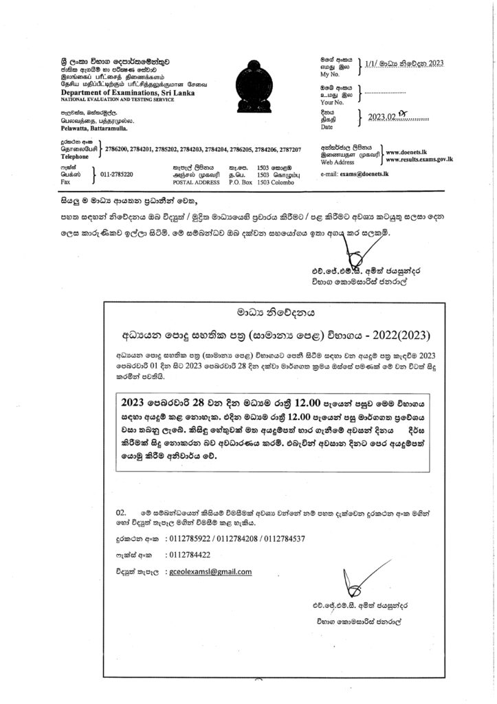 අයදුම්පත් භාරගන්නා අවසාන දිනය වන පෙබරවාරි 28 වන දින මධ්යම රාත්රි 12.00 න් පසු කිසිඳු හේතුවක් නිසා නැවත අයදුම්පත් භාර නොගන්නා බැවින් අවසාන දිනට පෙර මාර්ග ගත ක්රමය ඔස්සේ අයදුම්පත් යොමු කරන ලෙස විභාග දෙපාර්තමේන්තුව දැනුම් දෙනවා.
