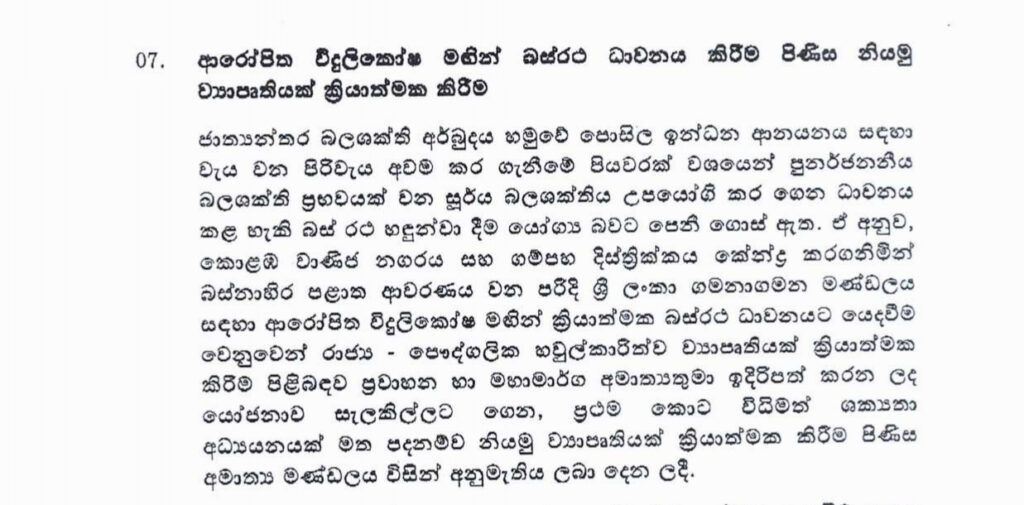 බලශක්ති අර්බුදයට පිළියමක් වශයෙන් සූර්ය බලශක්තිය උපයොගි කර ගෙන ධාවනය වන බස් රථ හඳුන්වාදීමේ නියමු ව්යාපෘතිය සඳහා කැබිනට් අනුමැතිය හිමිව තිබෙනවා.