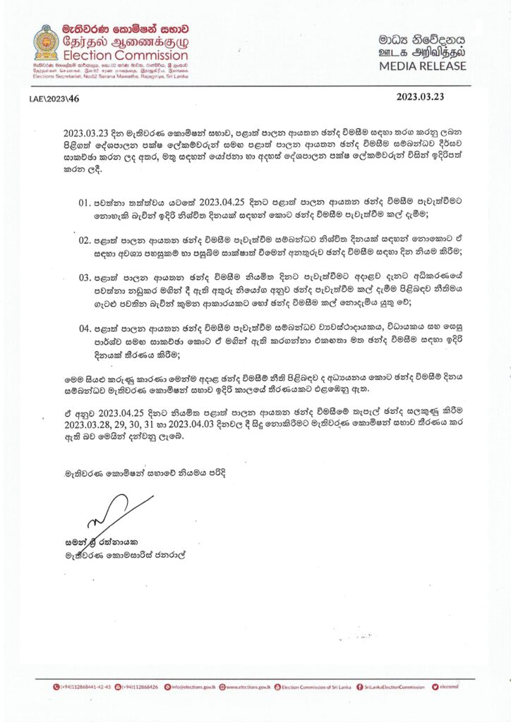 පළාත් පාලන මැතිවරණය පැවැත්වීම පිළිබඳව නියමිත දිනයක් ඉදිරියේදී දැනම් දෙන බව මැතිවරණ කොමිසම වැඩිදුරටත් පවසනවා.