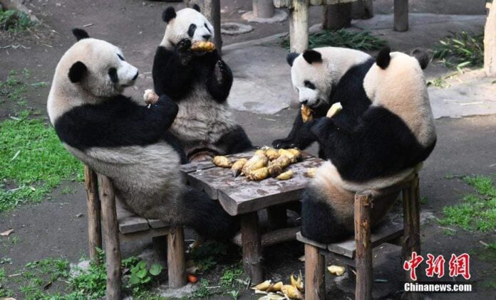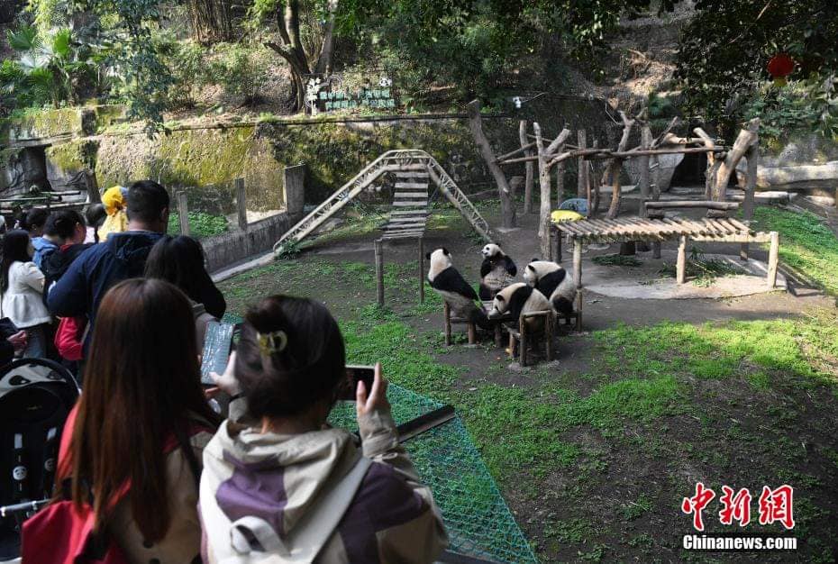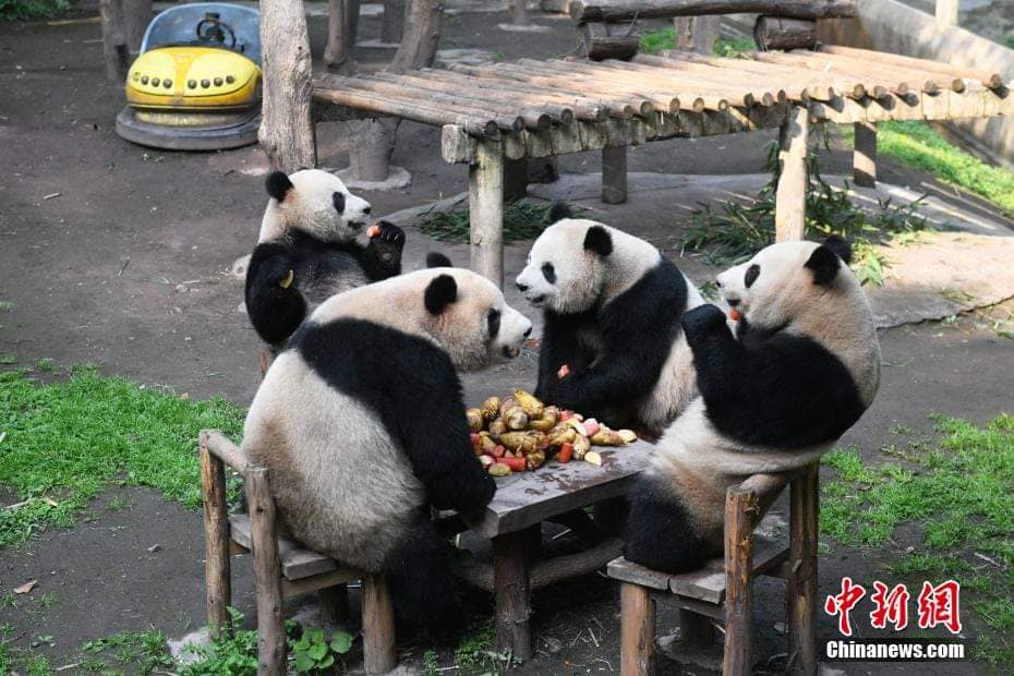 චීනයේ Chongqing සත්වෝද්‍යානයේ මේසයක් වටේ වාඩි වී රසවත් ආහාර භුක්ති විඳින මෙම යෝධ පැන්ඩාවන් හතර දෙනාගේ දර්ශන මාධ්‍යයට එක් කිරීමෙන් පසු ලොව විශාල සංචාරකයින් පිරිසකගේ ආකර්ෂණය එම පැන්ඩාවුන් වෙත යොමුව තිබේ.
