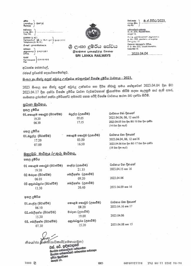 සිංහල හින්දු අලුත් අවුරුද්දු උත්සව සමය සහ දීර්ඝ නිවාඩු කාලය හේතුවෙන් 2023.04.04 දින සිට 2023.04.17 දක්වා විශේෂ දුම්රිය සේවාවක් ක්රියාත්මක වන බව දුම්රිය දෙපාර්තමේන්තුව දැනුම් දෙනවා.