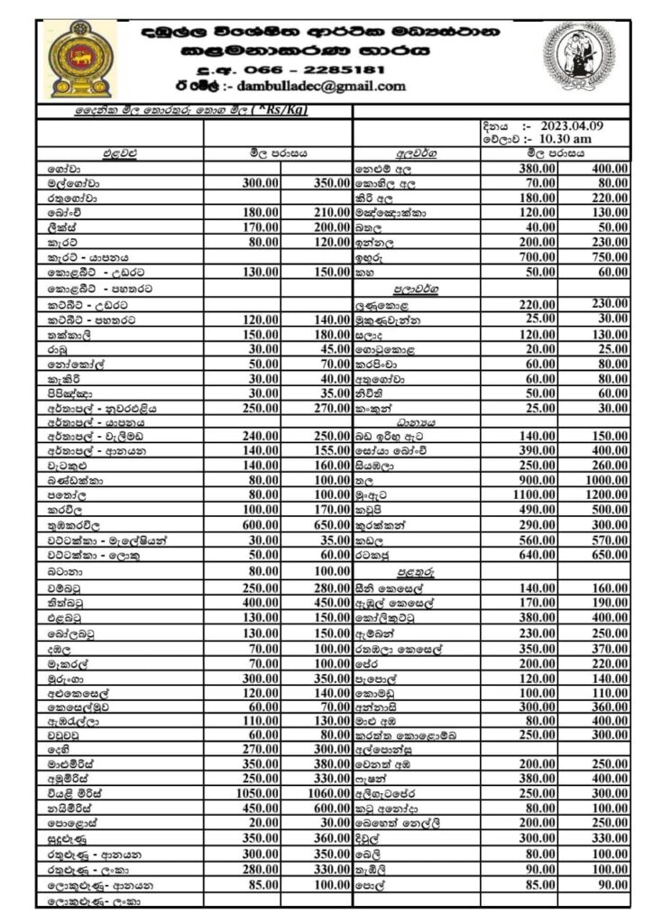 දඹුල්ල විශේෂිත ආර්ථික මධ්යස්ථානයේ අද (09) දිනට නියමිත එළවළුවල මිල ගණන් ප්රකාශයට පත් කර තිබෙනවා.
