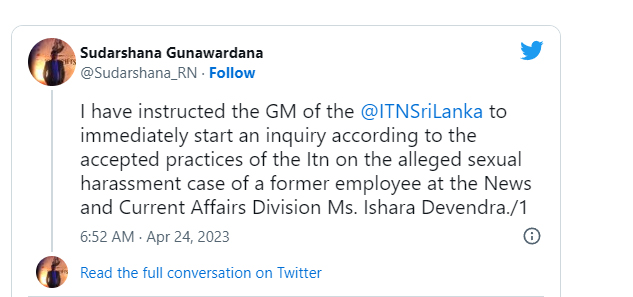 ආයතනයේ ඉහළ නිලධාරීන්ගේ ලිංගික අල්ලස් බලපෑම මත තමන් සිය රැකියාවෙන් ඉවත් වීමට තීරණය කළ බව ඉෂාරා දේවේන්ද්ර සමාජ මාධ්ය තුළ සටහනක් තබමින් පසුගියදා ප්රකාශ කර තිබුණා.