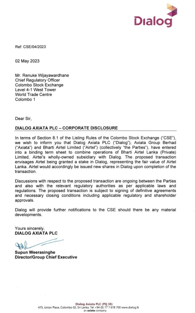 Dialog Axiata Plc (“Dialog”), ආයතනය සමගින් ඒකාබද්ධව ශ්‍රී ලංකාව තුළ සිය මෙහෙයුම් කිරීමට Bharti Airtel Limited (“Airtel”) සමාගම තීරණය කිරීම මීට හේතුවයි.