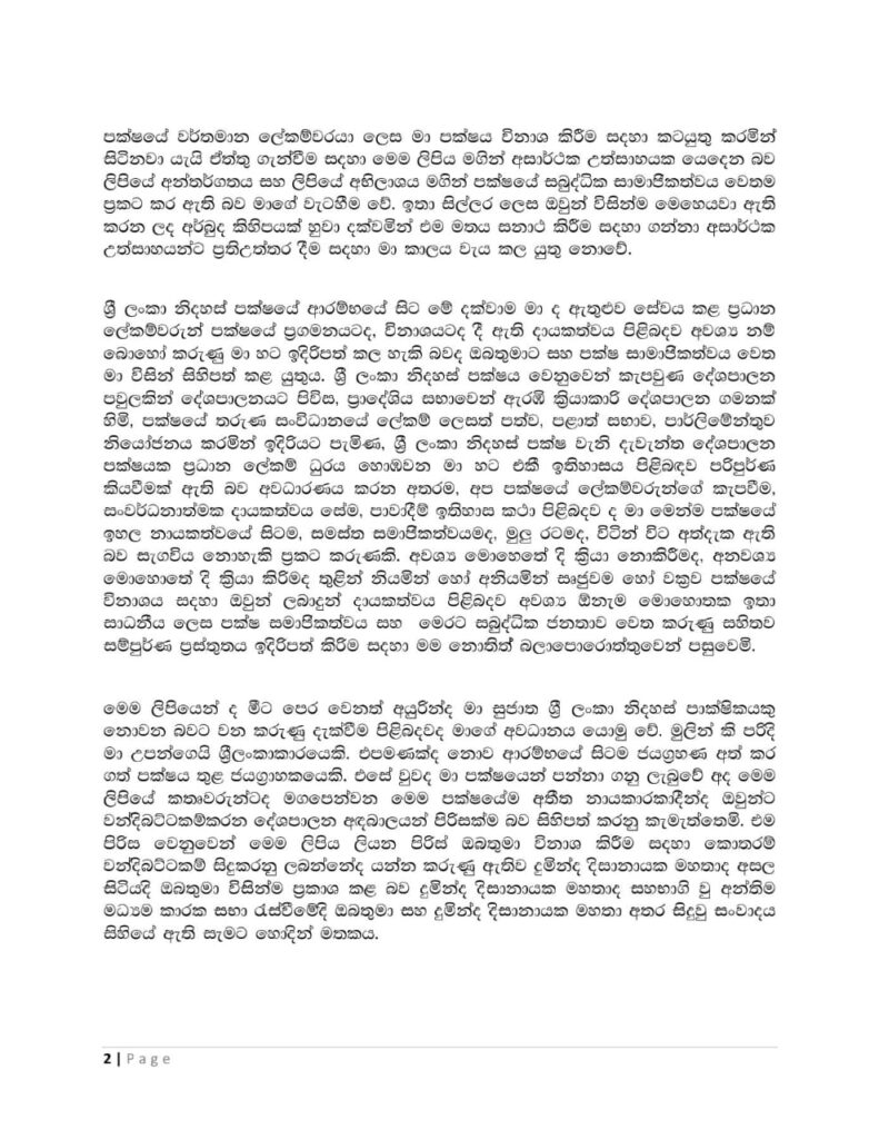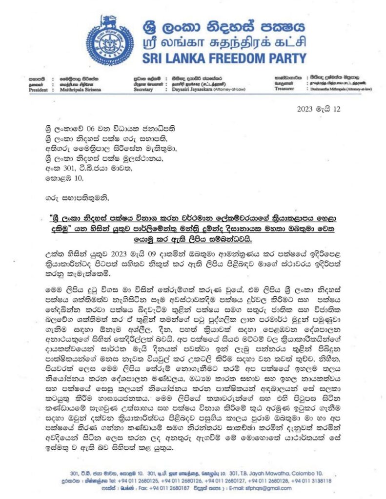 අදාළ ලිපිය නිදහස් පක්ෂයේ සභාපති හිටපු ජනාධිපති මෛත්රීපාල සිරිසේන මහතා වෙත යොමු කර ඇත.