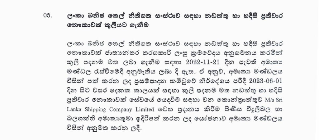 ඒ සඳහා වන කොන්ත්රාත්තුව M/s srilanka shipping company limited ආයතනය වෙත ප්රධානය කිරීම වෙනුවෙන් ඉදිරිපත් කළ යෝජනාවට කැබිනට් අනුමැතිය හිමිව තිබේ.