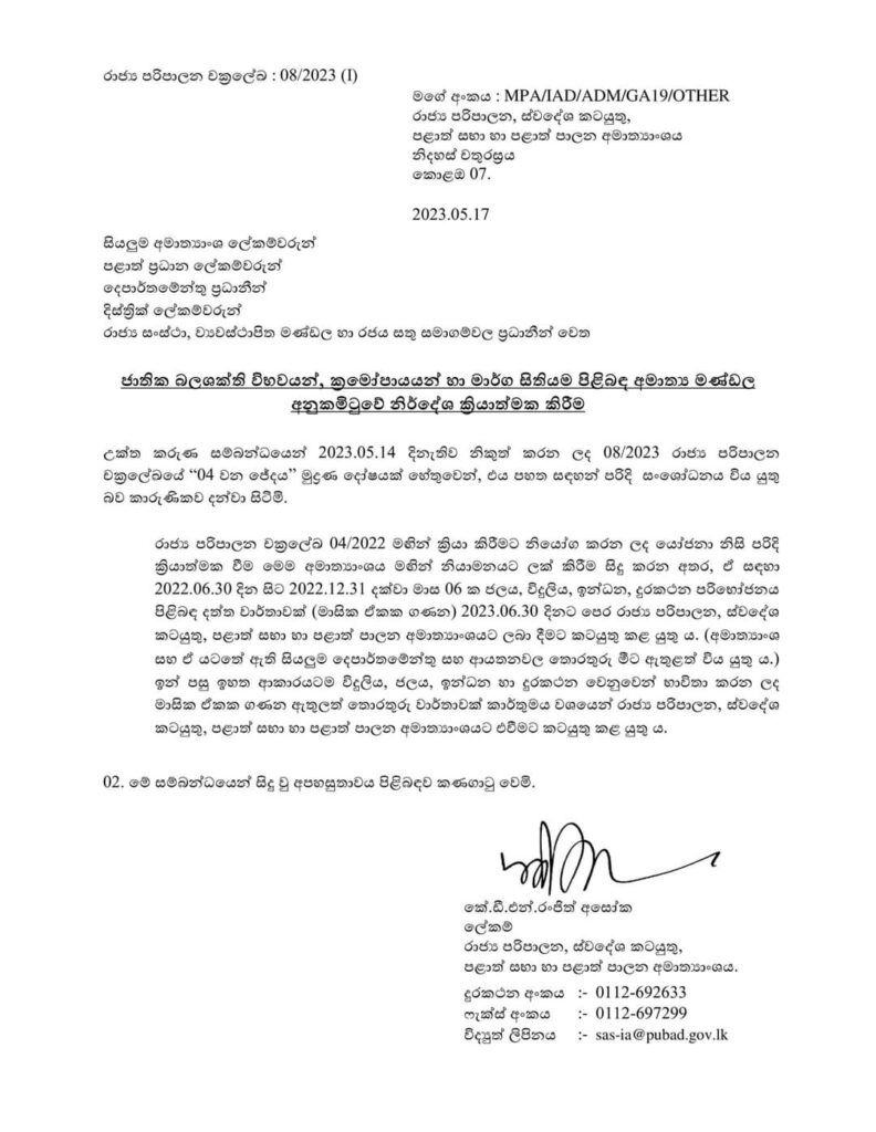 රාජ්ය පරිපාලන, ස්වදේශ කටයුතු, පළාත් සභා හා පළාත් පාලන අමාත්යාංශය විසින් චක්රලේඛයක් නිකුත් කරමින් ඒ බව සඳහන් කර ඇත.