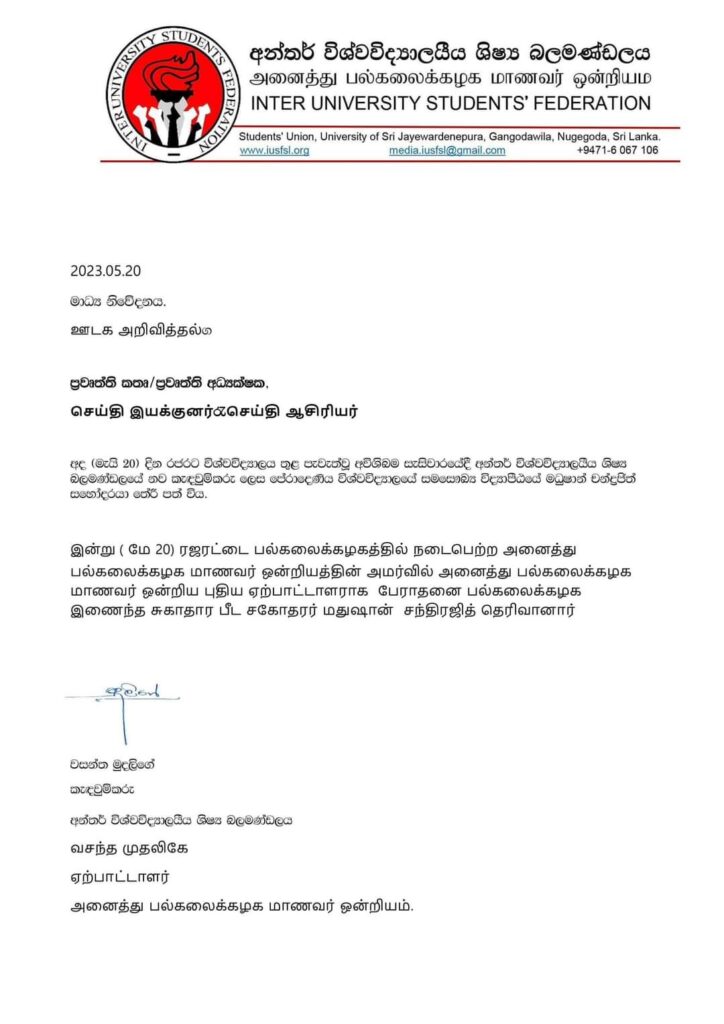 රජරට විශ්වවිද්යාලයේ ඊයේ (20) පැවති විශේෂ සැසිවාරයකදී මෙම තීරණය ගත් බව අන්තර් විශ්වවිද්යාල ශිෂ්ය බලමණ්ඩලය නිවේදනය කරනවා.