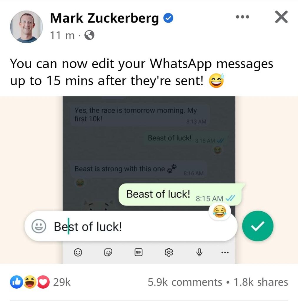 ඒ අනුව වට්ස්ඇප් හරහා යවනු ලබන පණිවිඩයක් විනාඩි 15 ක් ඇතුළත නැවත සංස්කරණය කිරීමේ හැකියාව වට්ස්ඇප් පරිශීලකයන්ට හිමිවෙනවා.