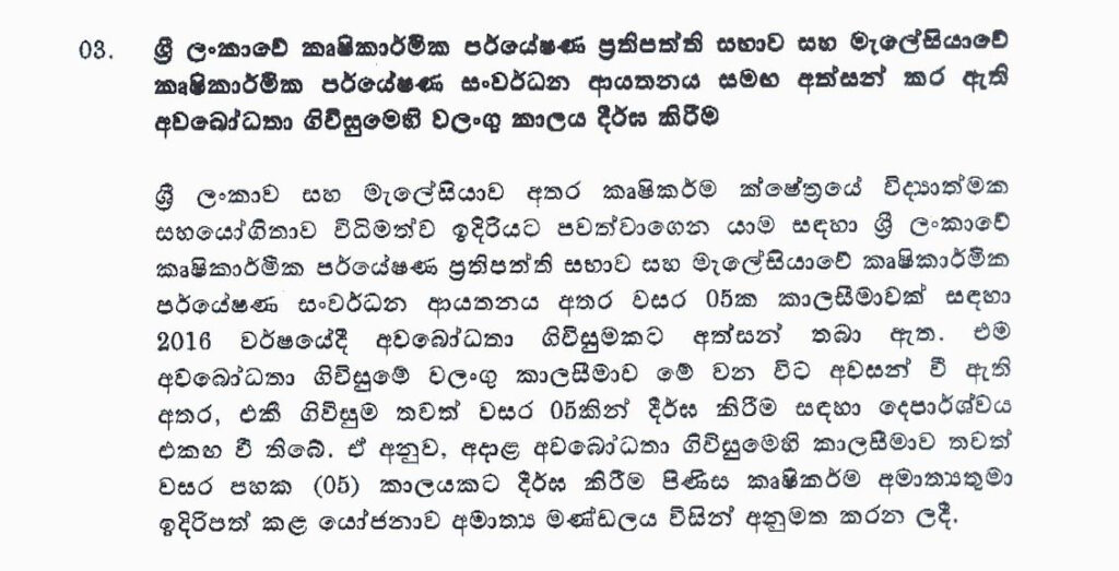 ශ්රී ලංකාව සහ මැලේසියාව අතර කෘෂිකර්ම ක්ෂේත්රය විද්යාත්මක සහයෝගිතාව සඳහා 2015දී වසර 5 ක් සඳහා අත්සන් කළ අවබෝධතා ගිවිසුම තවත් වසර 5 කින් දීර්ඝ කිරීම සඳහා අනුමැතිය හිමිව තිබේ.