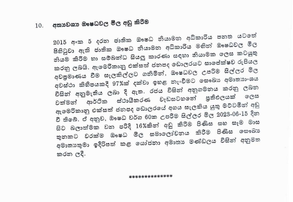 අත්යවශ්ය ඖෂධ වර්ග 60 ක උපරිම මිල 16% කින් පහළ දැමීම සඳහා කැබිනට් අනුමැතිය හිමිව තිබෙනවා.