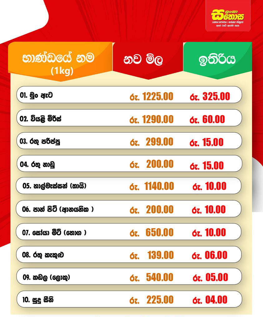 මිල අඩුකළ භාණ්ඩවල නව මිල ගණන් එම ආයතනය ඊයේ (08) ප්රකාශ කළා.
