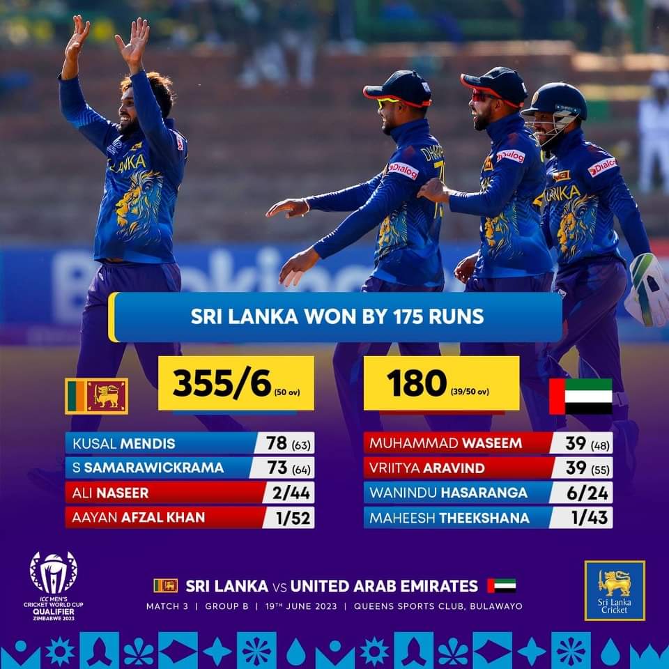 ලෝක කුසලානයට සුදුසුකම් ලැබීමේ තරගාවලියේ එක්සත් අරාබි එමීර් (UAE) කණ්ඩායමට එරෙහිව සහභාගි වූ තරගයෙන් ශ්රී ලංකාවට ලකුණු 175ක විශිෂ්ට ජයක් හිමිවිය.