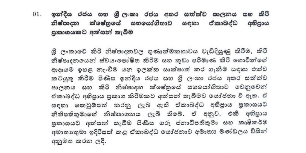 ඉන්දීය රජය හා ශ්රී ලංකාව අතර සත්ත්ව පාලනය සහ කිරි නිෂ්පාදන ක්ෂේත්රයේ සහයෝගිතාව පිළිබඳව එකඟතාවයකට පැමිණීමට යෝජනා වී තිබෙනවා.