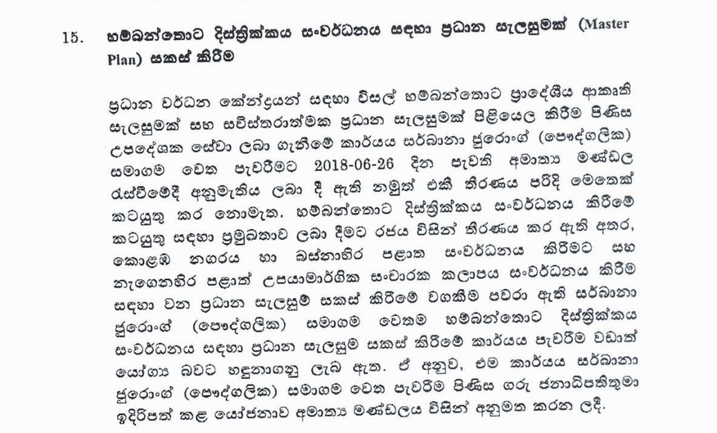 හම්බන්තොට සංවර්ධනය සඳහා වූ ප්‍රධාන සැලසුම සකස් කිරීමේ වගකීම “සර්බානා ජූරොංග්” පෞද්ගලික ආයතනයට පැවරීම සඳහා ජනාධිපතිවරයා විසින් ඉදිරිපත් කළ යෝජනාවට කැබිනට් අනුමැතිය හිමිව ඇත.