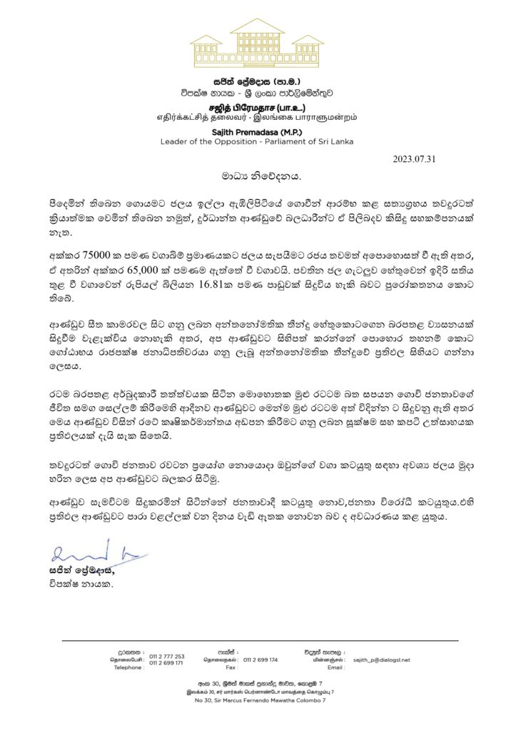 පීදෙමින් පවතින ගොයමට ජලය ඉල්ලා ඇඹිලිපිටිය ගොවීන් ආරම්භ කළ සත්යග්රහය තවදුරටත් ක්රියාත්මක වූවද ආණ්ඩුව ඒ පිළිබඳව කිසිදු තැකීමක් නොකරන බව විපක්ෂ නායක සජිත් ප්රේමදාස මහතා පවසනවා.