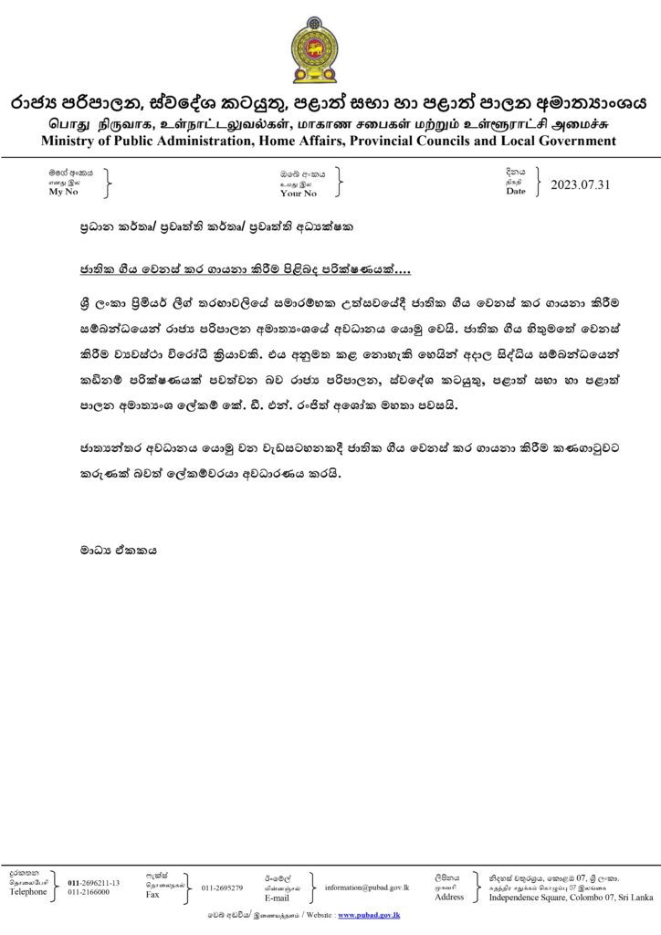 ශ්රී ලංකා ප්රිමියර් ලීග් 2023 සමාරම්භක උත්සවයේදී ජාතික ගීය වෙනස් කර ගායනා කිරීම සම්බන්ධයෙන් කඩිනම් පරීක්ෂණයක් පැවැත්වීමට රාජ්ය පරිපාලන, ස්වදේශ කටයුතු, පළාත් පාලන සභා හා පළාත් පාලන අමාත්යාංශය තීරණය කර තිබෙනවා.