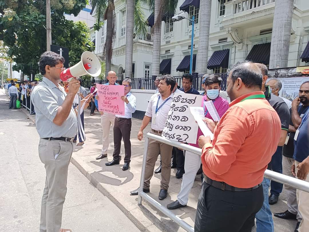 ශ්රී ලංකා ටෙලිකොම් කොටස් විකිණීම වෙනුවෙන් සේවක වරප්රසාද කප්පාදු කිරීම ගැන ටෙලිකොම් වෘත්තීය සමිති සහ සේවක විරෝධතා උද්ගෝෂණයක් පැවැත්වුණා.