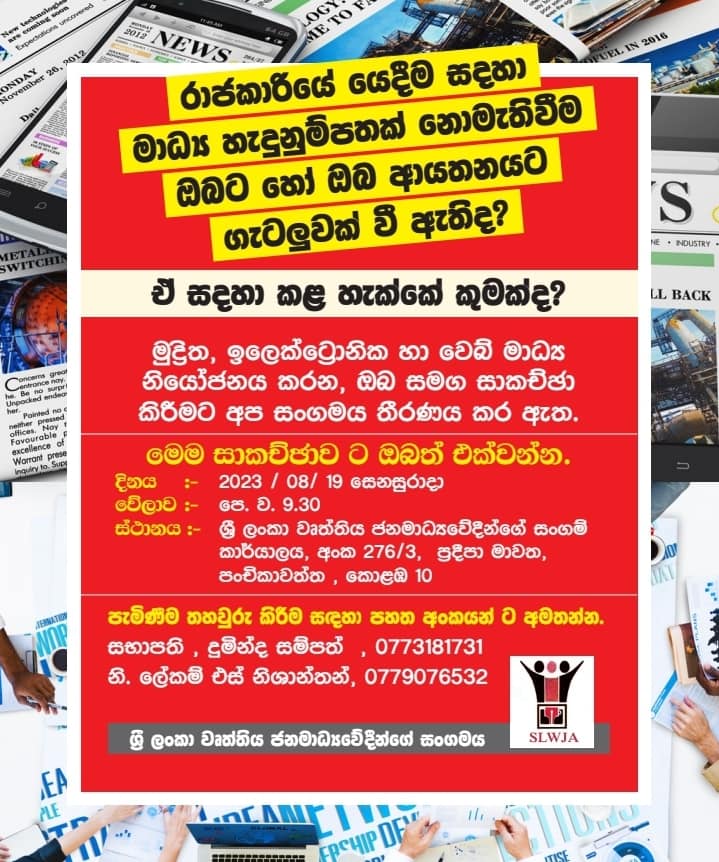 මාධ්යකරණයේ යෙදෙන එහෙත් මාධ්ය හැඳුනුම්පතක් නොමැති මධ්යවේදීන් හා මාධ්ය ආයතන වෙනුවෙන් ශ්රී ලංකා වෘත්තීය ජනමාධ්යවේදීන්ගේ සංගමය විසින් විශේෂ සාකච්ඡාවක් කැඳවා තිබෙනවා.
