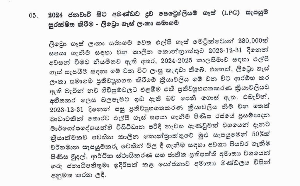 2023 සහ 2024 යන වසරවලට අඛන්ඩ එල්පී ගෑස් සැපයුමක් ලබාගැනීම වෙනුවෙන් නැවත ඇණවුමක් වශයෙන් 50%ක සැපයුමක් වාර්තමාන සැපයුම්කරු වන ලිට්රෝ ගෑස් සමාගමෙන් මිලදී ගැනීමට රජය තීරණය කර තිබෙනවා.