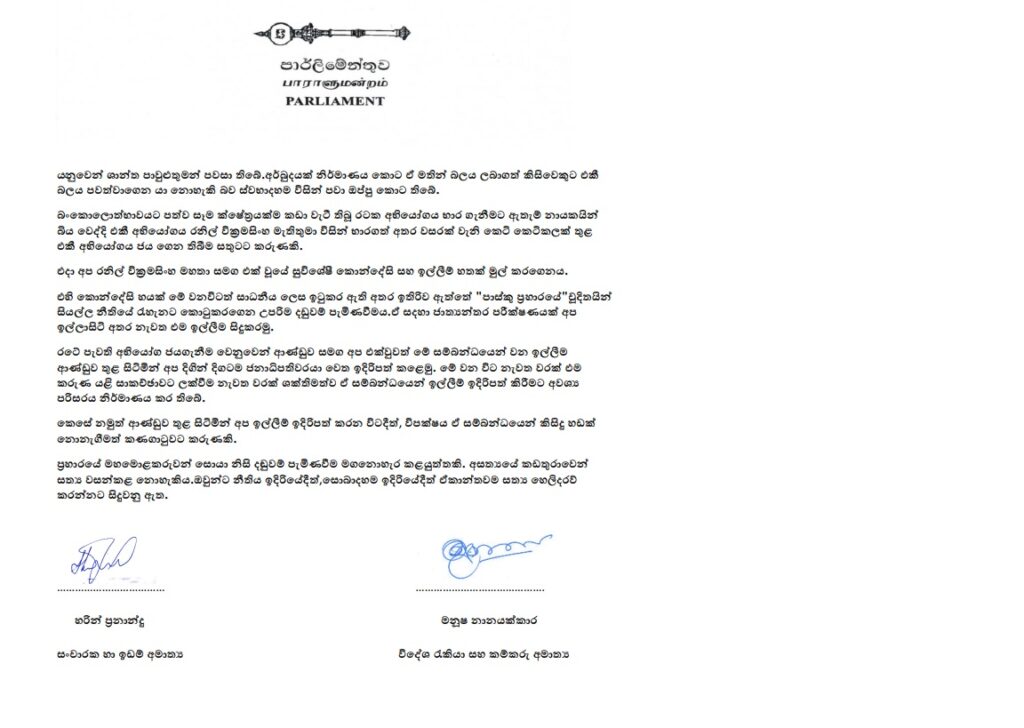 පහත දැක්වෙන්නේ එම ලිපියයි.