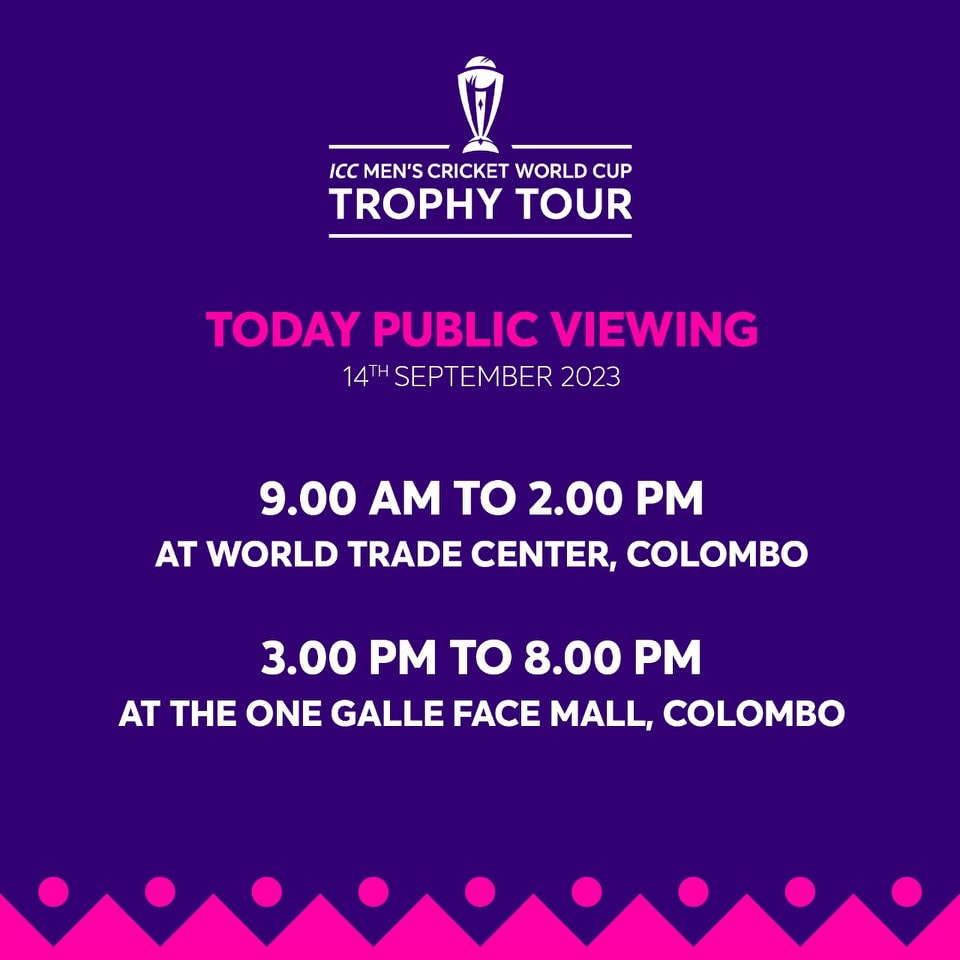 අයි.සී.සී 2023 ක්රිකට් (පිරිමි) ලෝක කුසලානය ලොව වටා ප්රදර්ශනය කෙරෙන සංචාරය, ශ්රී ලංකාවට පැමිණ තිබෙනවා.