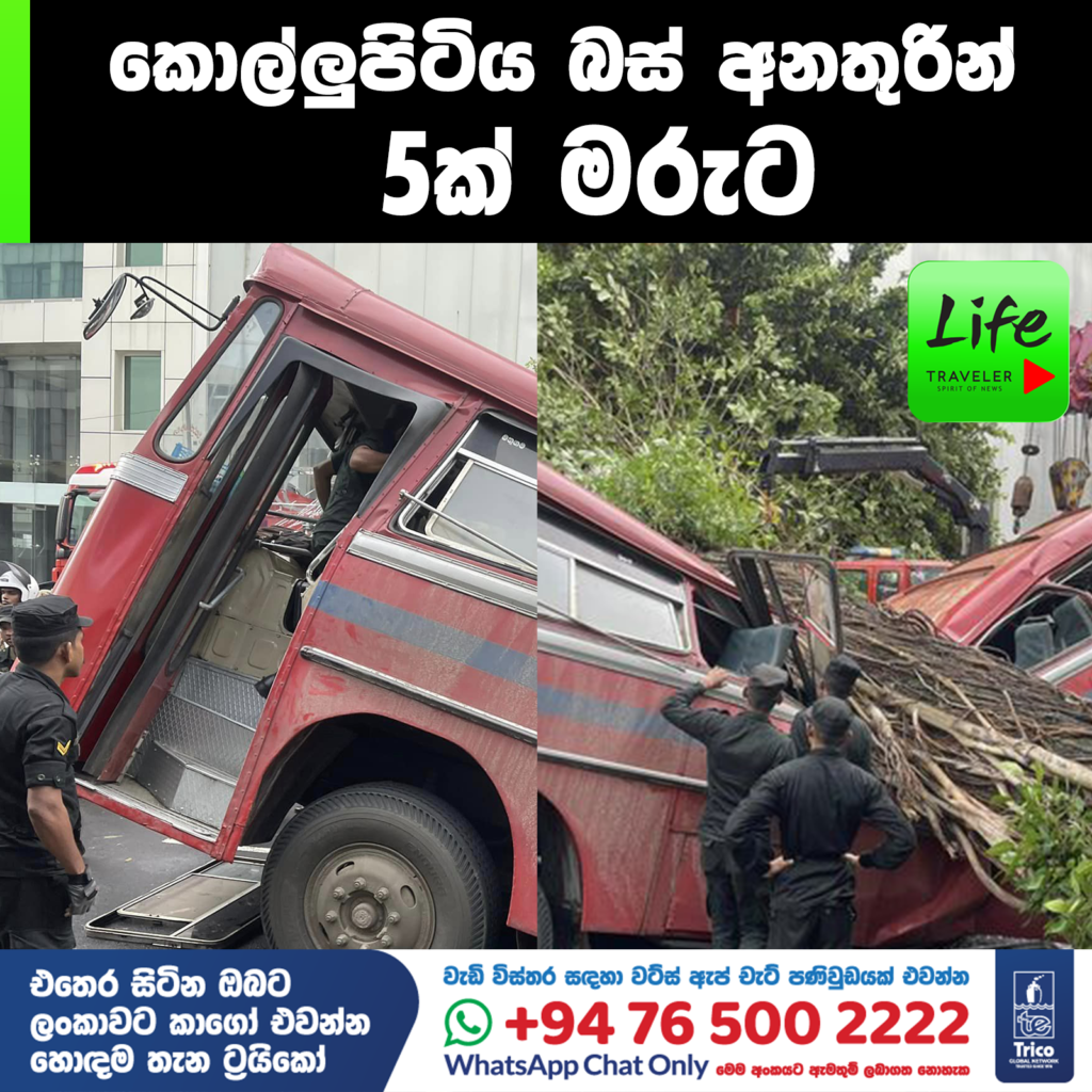 අද (06) උදෑසන කොල්ලුපිටිය ඩුප්ලිකේෂන් මාර්ගයේ දී බස් රථයක් මතට ගසක් කඩා වැටීමෙන් සිදුවූ අනතුරින් පුද්ගලයින් 05 දෙනෙකු මියගිය බව ජාතික රෝහල පවසනවා.