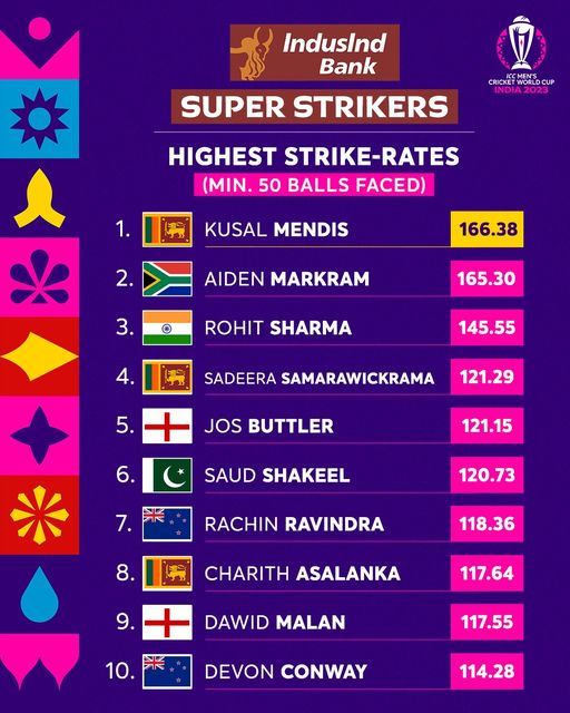 2023 එක්දන ක්රිකට් ලෝක කුසලානයේ මේ දක්වා පැවති තරග අතරින් ලකුණු ලබාගැනීමේ ප්රහාරත්මක වේගය වැඩිම පිතිකරුවා බවට ශ්රී ලංකා කණ්ඩායමේ කුසල් මෙන්ඩිස් පත්ව තිබෙනවා.