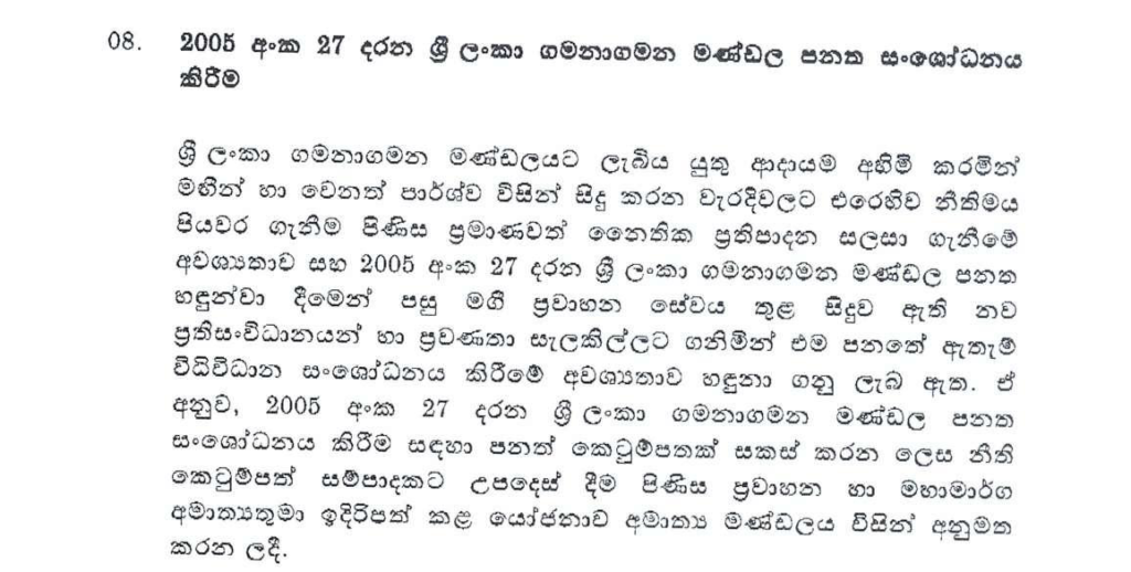 2005 අංක 27 දරන ශ්රී ලංකා ගමනාගමන මණ්ඩල පනත සංශෝධනය කිරීමට අමාත්ය මණ්ඩලයේ අනුමැතිය හිමිව තිබෙනවා.