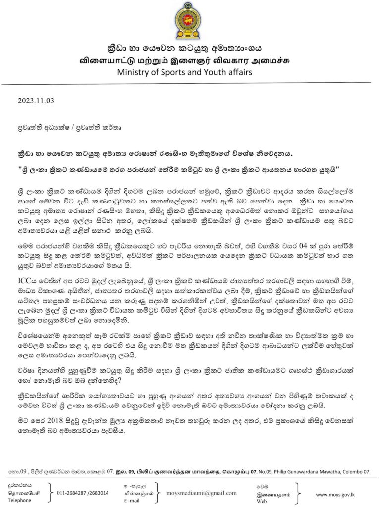 දීර්ඝ නිවේදනයක් කරමින් ඒ මහතා පවසන්නේ ශ්රී ලංකා ක්රිකට් කණ්ඩායමේ පරාජය පිළිබද සියලු වගකීම් ශ්රී ලංකා ක්රිකට් ආයතනය හා තේරීම් කමිටුවට භාර ගත යුතු බවයි.
