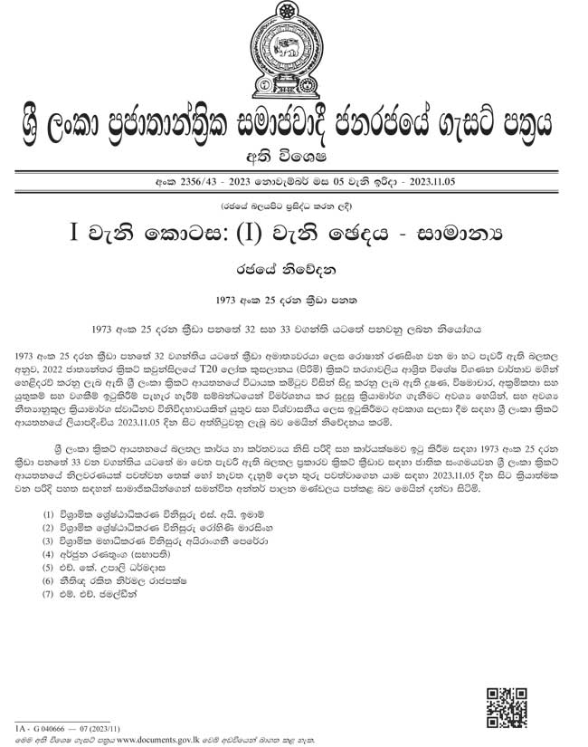 ක්රීඩා අමාත්ය රොෂාන් රණසිංහ විසින් පත්කළ ක්රිකට් අතුරු කමිටුවේ බලතල දක්වමින් අති විශේෂ ගැසට් නිවේදනයක් නිකුත් කර තිබෙනවා.