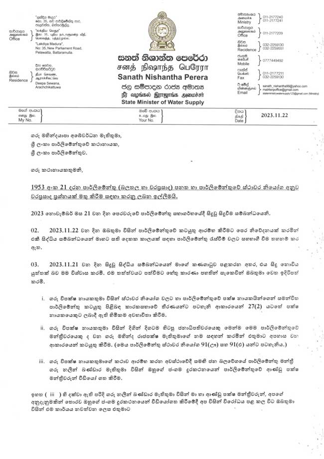 තමාට සති දෙකක පාර්ලිමේන්තු තහනමක් පැනවීම සම්බන්ධයෙන් පාර්ලිමේන්තු මන්ත්රී සනත් නිශාන්ත මහතා කතානායකවරයාට නිවේදනයක් නිකුත් කර තිබෙනවා.