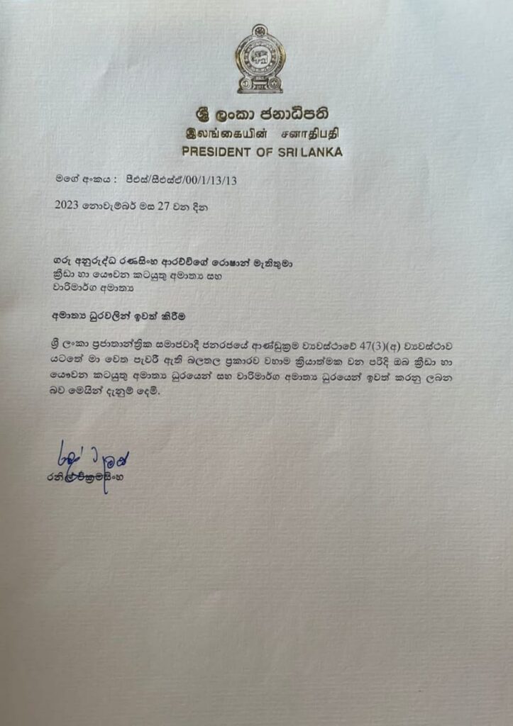 ක්රීඩා,යෞවන කටයුතු සහ වාරිමාර්ග අමාත්ය රොෂාන් රණසිංහ මහතා වහාම ක්රියාත්මක වන පරිදි එම ධුරවලින් ඉවත් කිරීමට තීරණය කර තිබෙනවා.