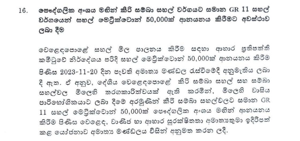 ඒ සඳහා වාණිජ හා ආහාර සුරක්ෂිතතා අමාත්යවරයා ඉදිරිපත් කළ යෝජනාවට කැබිනට් අනුමැතිය හිමිව තිබෙනවා.