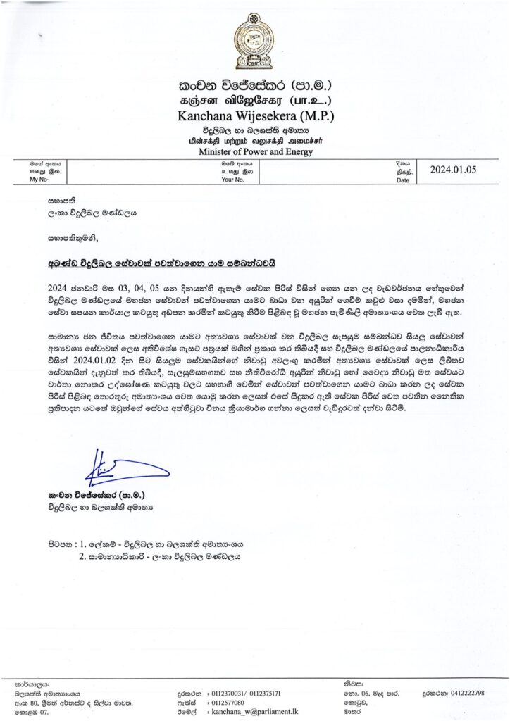 විදුලිබලය අත්යවශ්ය සේවාවක් ලෙස නම් කර තිබියදී සහ පාලනාධිකාරිය විසින් නිවාඩු අවලංගු කර තිබියදී, නීතිවිරෝධී නිවාඩු හෝ වෛද්ය නිවාඩු මත සේවයට වාර්තා නොකර උද්ඝෝෂණ කටයුතුවලට සහභාගි වූ නීතිවිරෝධී අයුරින් කටයුතු කළ සේවකයින්ගේ සේවය අතිහිටුවා විනය ක්රියාමාර්ග ගන්නා ලෙස විදුලිබල අමාත්යවරයා ලිපියෙන් ලංකා විදුලිබල මණ්ඩල පාලනාධිකාරියට දන්වා තිබෙනවා.