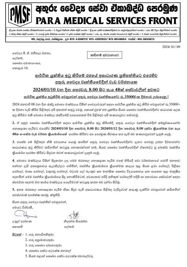 අද උදෑසන 08.00 සිට පැය 48ක සංකේත වර්ජනයක් ක්රියාත්මක කිරීමට අතුරු වෛද්ය සේවා ඒකාබද්ධ පෙරමුණ තීරණය කර තිබෙනවා.