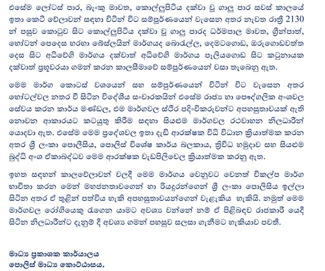 අදාළ විශේෂ රථවාහන සැලැස්ම සම්බන්ධයෙන් පොලිසිය නිකුත් කළ නිවේදනය පහතින්,