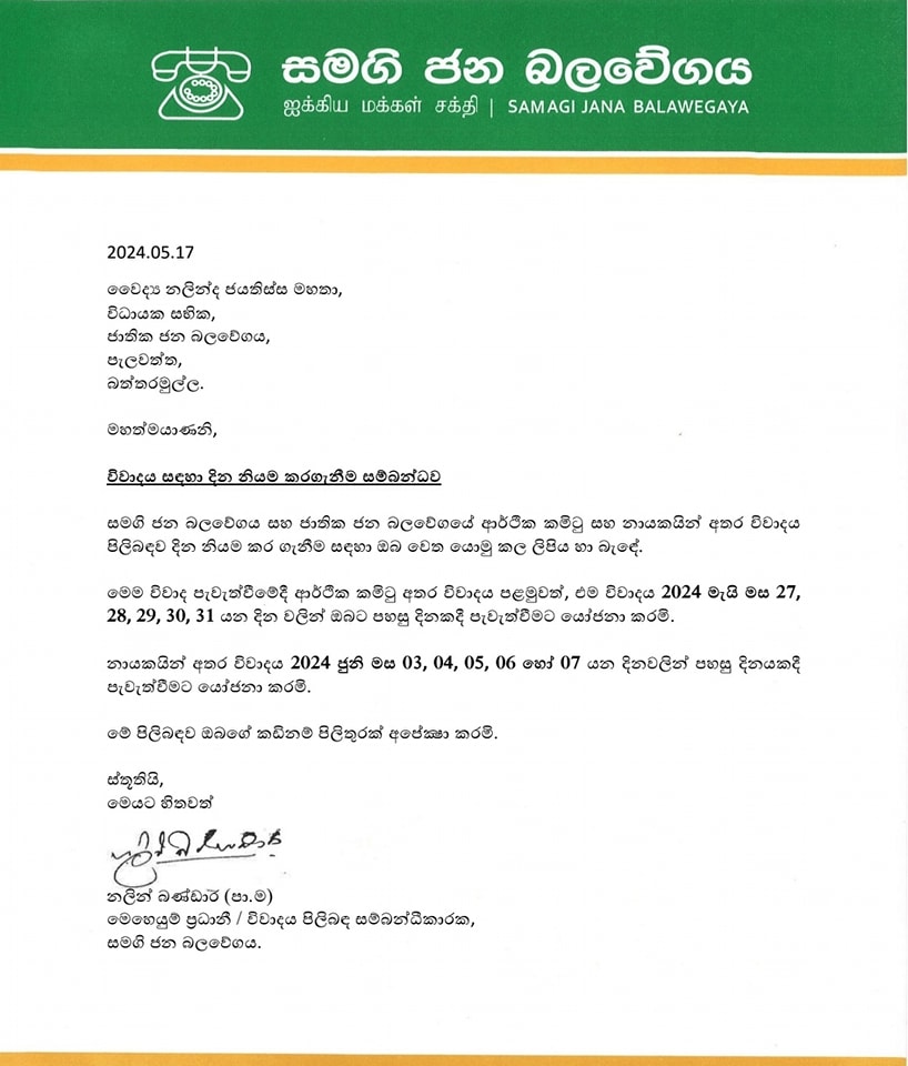 සමගි ජන බලවේගයේ පාර්ලිමේන්තු මන්ත්රී නලින් බණ්ඩාර මහතා විසින් යොමුකර ඇති එම ලිපියෙහි දැක්වෙන්නේ පක්ෂ දෙකෙහි ආර්ථික කමිටු අතර විවාදය 2024 මැයි 27 සහ මැයි 31 දිනවලින් එකකදීත්,