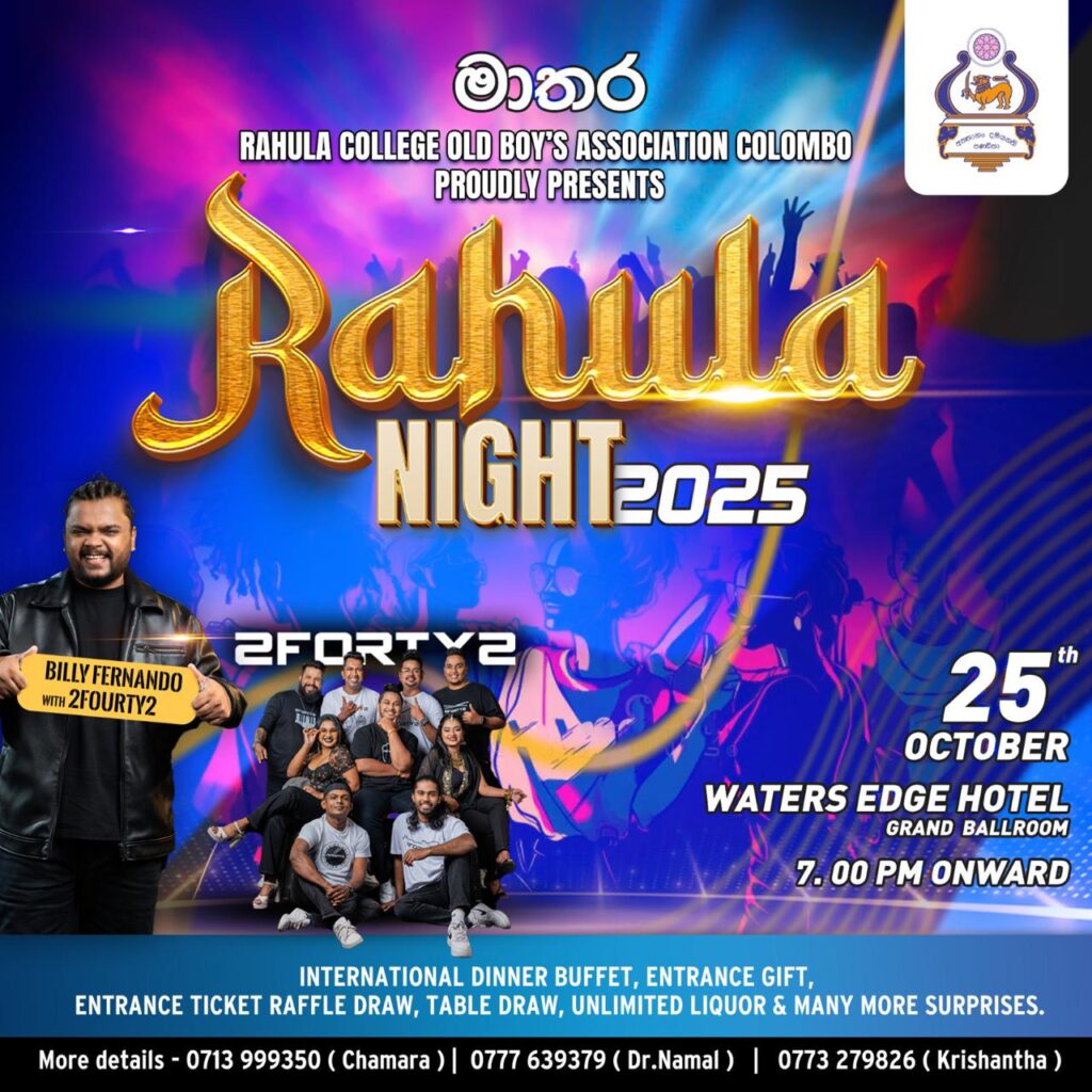 මාතර රාහුල විද්යාලීය කොළඹ ආදිශිෂ්ය සංගමය සජවිධානය කරන රාහුල නයිට් 2025, අති උත්කර්ෂවත් අන්දමින් ඔක්තෝබර් මස 25 වන සෙනසුරාදා ,වෝටර්ස්ඒජ්,පරිශ්රයේදී පැවැත්වීමට කටයුතු යොදා තිබෙනවා.