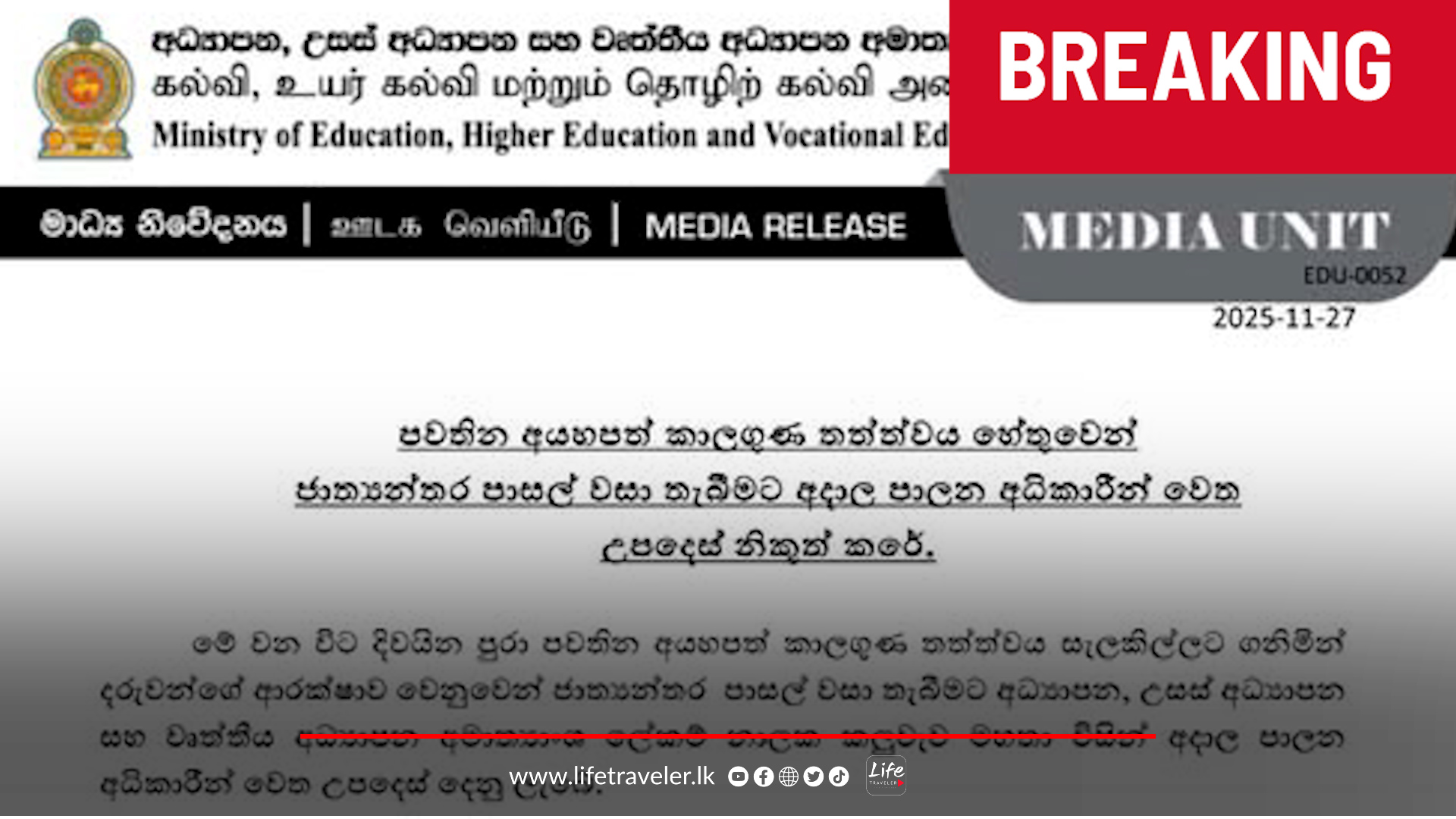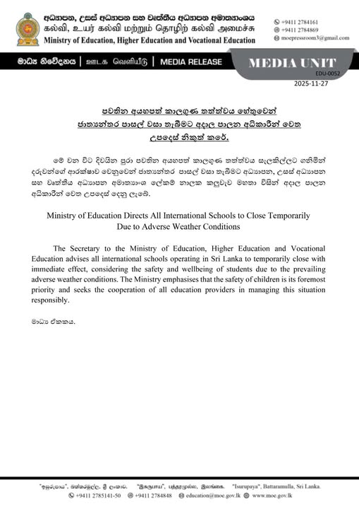 පවතින අයහපත් කාළගුණ තත්වය නිසා හෙට දිනයේ ජාත්‍යන්තර පාසල් වසාදමන්න රජයේන නියෝග කළ තිබෙනවා.